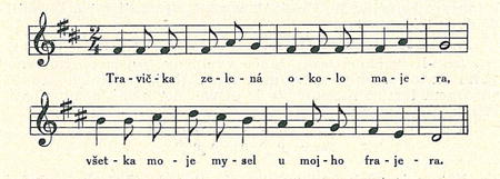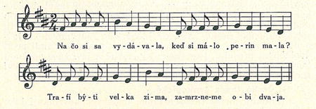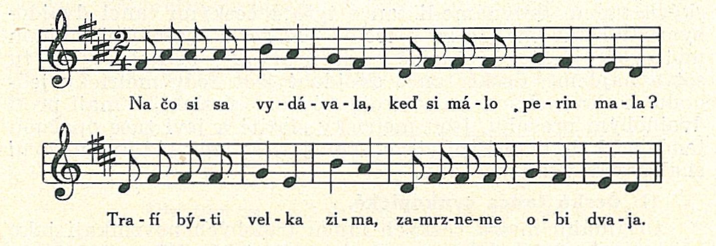 U dvojdobých tanců slovenských shledáváme se však s trojtaktovými motivy velmi často. Více než desítima těchto tanců člení své melodie veskrze v trojtaktové úryvky. Příkladem uvedena píseň