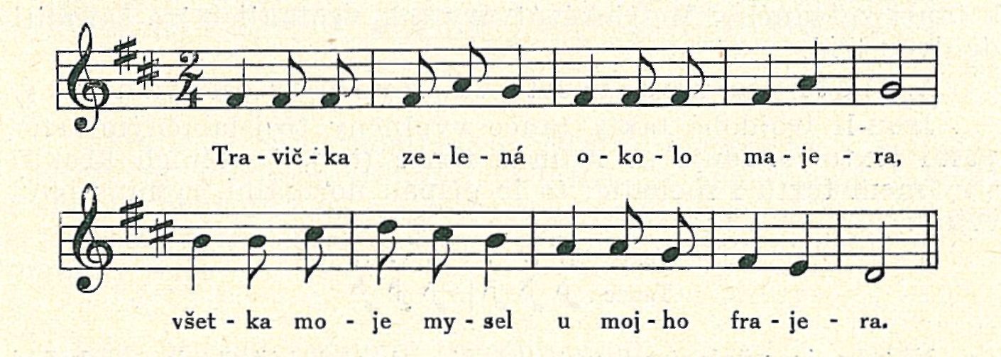 Na této písni viidimle ještě jinou zvláštnost. Trojtaktový motivek druhý je totiž, melodicky shodný » dvojtaktovým prvním, má však konečné tony protaženy, čímž se právě prodloužil o jeden takt. Toto protaženi konečného úryvku je hudebním znakem právě „krakoviaku"; jeho psychologický původ jest