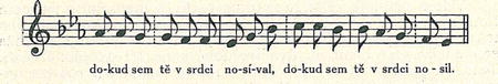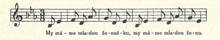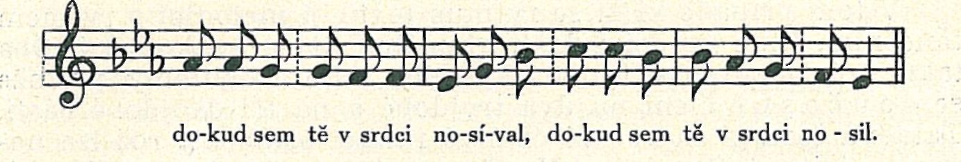 Rytmické členy tohoto metrického' schematu mohou ste však rozmanitě seskupovat!, čímž vznikají typické varianty. Tak na př. stahují se první dva dvojdobé členy dlouhou notou v celek, čímž vzniká „rytmus čepení", který jsem tak nazval podle svatební písně, v níž se vyskytuje; uvádím jen její začátek :