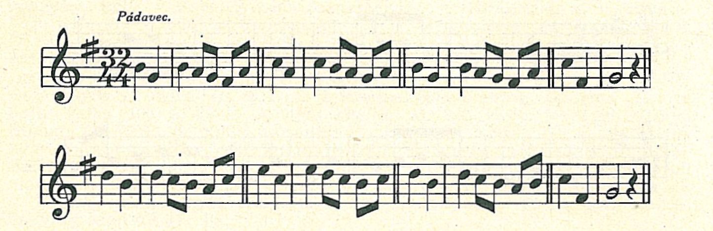 Tance nepravidelnější, jež lze výstižně pojmenovati „směs-ky", kombinují svrchu uvedené metrické typy s úryvky neproměnnými. Jest jich veliké množství; přes to lze většinu jich uspořádati do dvanácti velikých skupin. Zbytek jest zcela nepravidelný. Odkazuje na citovaný svůj článek, uvedu zde příkladem jen jeden směsek (resp. jeho první díl) dosti pravidelný obsahující typy višně, zakončené dvěma takty sousedské:*)