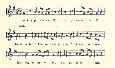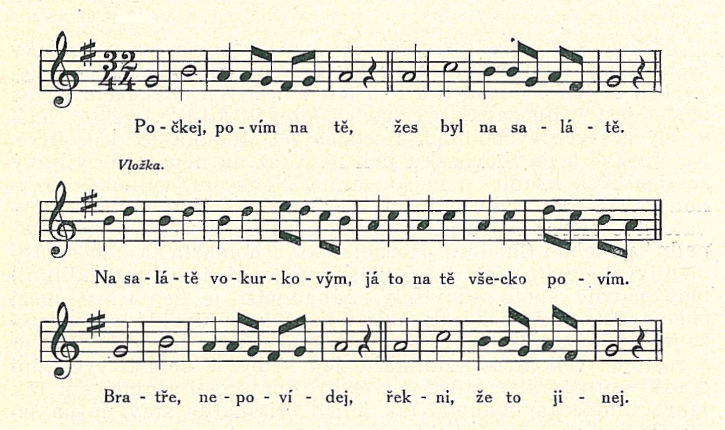 Mezi tance celkem pravidelné možno počítat i ty, jež v druhém dílu mají „vložku" v taktu neproměnném, ať již obkročá-kovou (jako třeba při „salátu") či sousedskou, nebo jež mají první díl neproměnného rázu takového (jako „slepička"). Uvedu tanec „salát", zajímavý tím, že jeho vložky užil Miozart v Donu Juanu (v „rejstříkové arii"):
