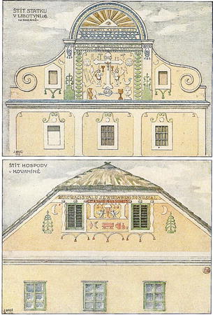 Výzdoba štítu živnosti »u Dudáků« v Libotyni. a 2. Štít na hospodě v Kovaníně.
