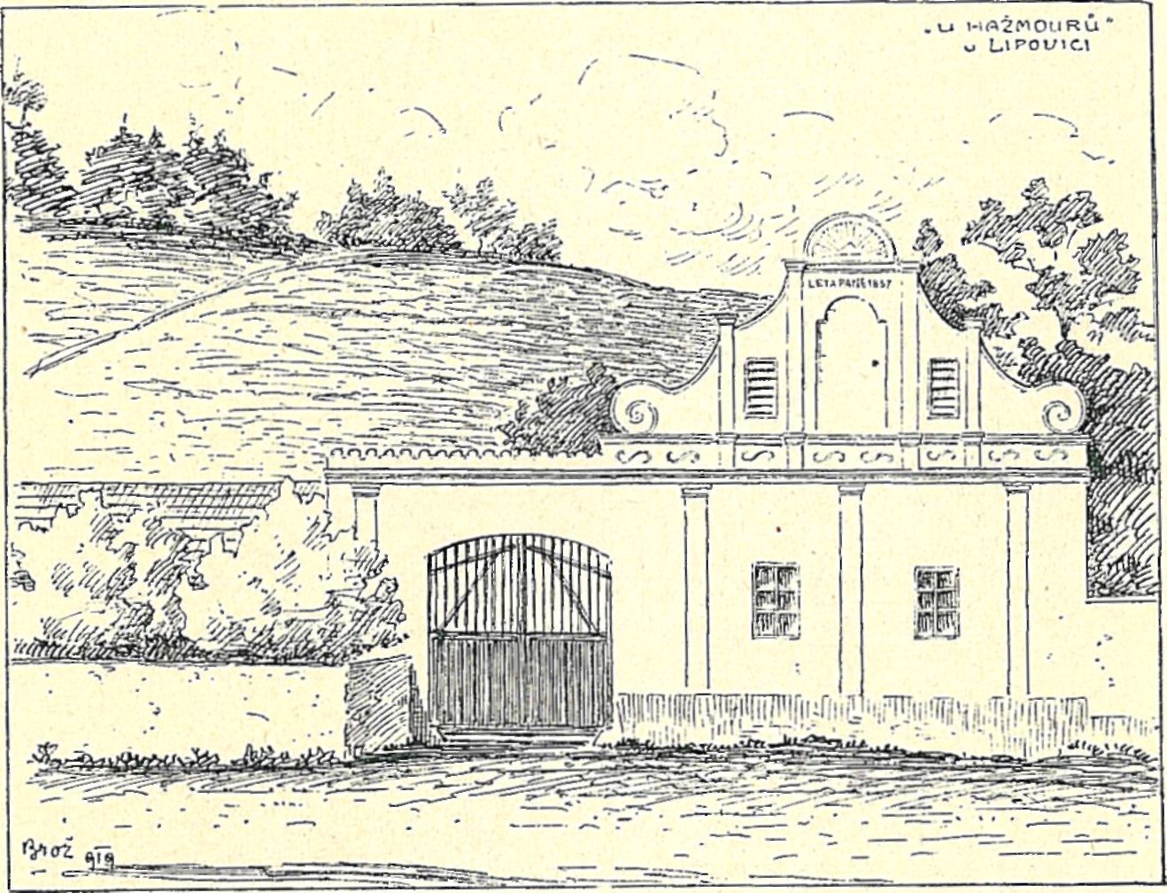 Průčelí živnosti ,,u Hažmourů" v Lipovici.